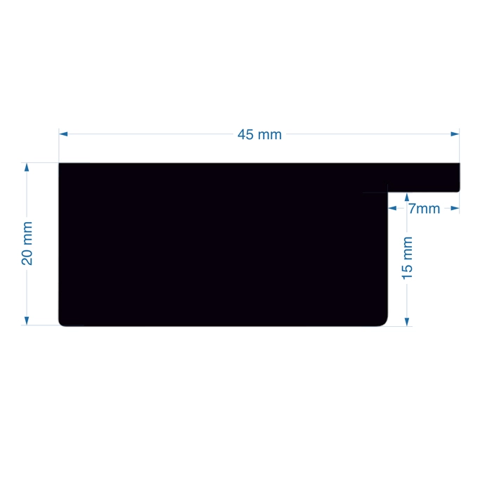 A 45mm wide flat profile with a total depth of 20mm. Finished in a metallic iron paint with slight pitted effect.