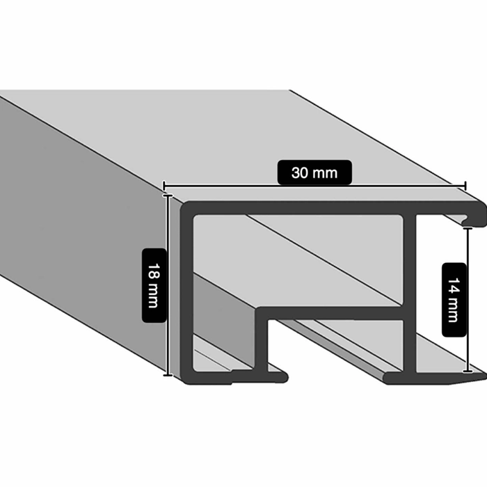 A 30mm wide flat profile, with a total depth of 18mm. Black aluminium finish with matching side.