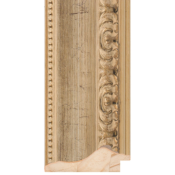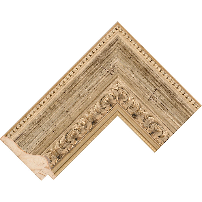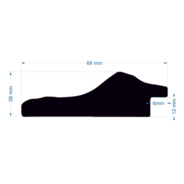 A 69mm wide reverse profile, with a total depth of 26mm. Finished in an antique silver leaf with decorative carvings.